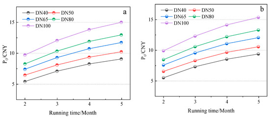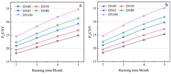 Figure 8 illustrates the variation in the total cost per unit length between electric heating tracing rock wool and glass wool pipelines. As depicted in Figure 7a,b, the economic thickness for the electric heating tracing glass wool pipeline exceeds that of the rock wool pipeline. This is attributed to glass wool’s higher thermal conductivity, which leads to increased heat loss costs. Consequently, both the economic thickness and the initial investment costs for glass wool are higher, resulting in a greater overall cost compared to the rock wool pipeline. Moreover, Figure 8 highlights that the difference in total cost becomes more pronounced with extended running times. Specifically, as the running time extends from 1440 h to 3600 h, the disparity in the total cost per unit length for a DN100 pipeline increases from CNY 0.24 to CNY 0.54. This trend underscores the significant impact of insulation material properties and operational duration on the cost-effectiveness of electric heating tracing systems. The increasing divergence in cost with longer running times emphasizes the need for the careful selection of insulation materials based on both thermal performance and economic considerations.