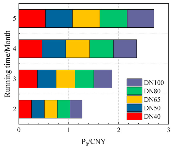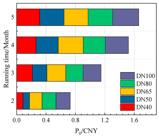 Figure 4 delineates the total costs associated with the insulation layer for different pipe diameters, categorized into initial investment and ongoing heat loss costs. This analysis reveals that the total cost escalates with both running time and pipe diameter. Specifically, the initial investment cost for a DN100 rock wool pipe rises from CNY 0.92 to 24.47% when the operation extends from 1440 to 3600 h. Concurrently, the cost attributable to heat loss surges by CNY 4.37, an increase of 73.57% over the same period, illustrating that the total cost is directly proportional to the running time. The comprehensive cost analysis for the same DN100 rock wool pipeline shows an overall increase in the total cost per unit length of CNY 5.3, or 54.70%, as the running time expands from 1440 to 3600 h. Additionally, as the pipe diameter enlarges, the required insulation thickness also increases, thereby raising both the initial investment and heat loss costs. For instance, at the 3600 h mark, the total cost per unit length for a DN40 rock wool pipe is 36.63% less than that of a DN100 pipe, clearly demonstrating the impact of pipe diameter on cost dynamics. This detailed breakdown underscores the significant economic factors that must be considered in the design and material selection for pipeline insulation systems.