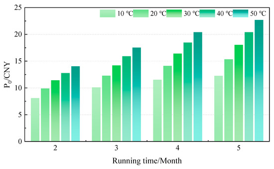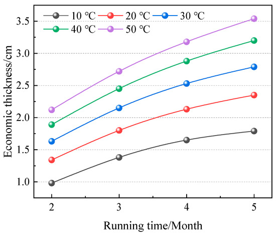The heat loss per unit length and at different average drilling fluid temperatures under the economic thickness of the glass wool pipe is less than the maximum allowable heat loss, as shown in Table 4. Therefore, the economic performance is selected as the index to optimize the insulation thickness, and the optimization results of insulation thickness are shown in Figure 9. As can be seen from Table 4, with the increase in average drilling fluid temperature, heat loss also increases. This is mainly because the increase in drilling fluid temperature increases the temperature difference with the external environment, thus increasing the heat loss. Take the running time of 3600 h as an example. When the drilling fluid temperature increased from 10 °C to 20 °C, 30 °C, 40 °C, and 50 °C, the heat loss of the insulation pipeline increased from 28.18 W/m2 to 34.39 W/m2 (22.04%), 39.56 W/m2 (40.38%), 43.50 W/m2 (54.36%), and 47.32 W/m2 (67.92%), respectively.