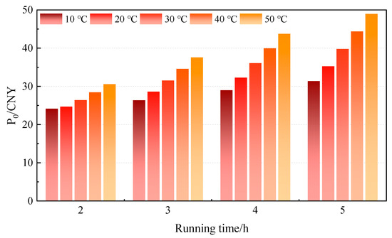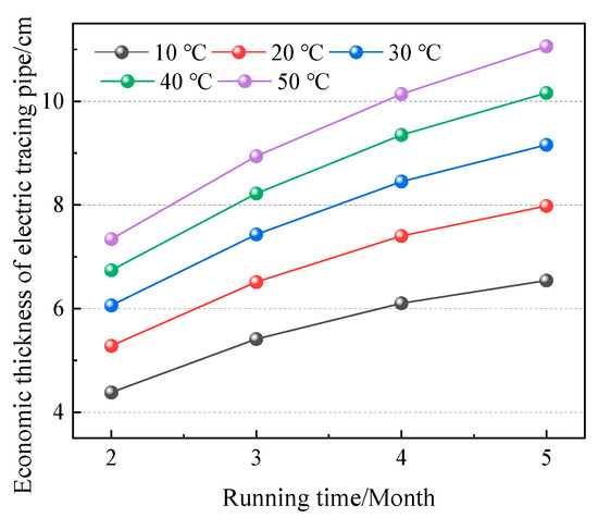Figure 11 shows the economic thickness of the DN100 electric heating tracing glass wool pipe when the average drilling fluid temperature is 10 °C, 20 °C, 30 °C, 40 °C, and 50 °C, respectively. Similar to the relationship between the economic thickness of insulation pipes and the average temperature of drilling fluid, the average temperature of drilling fluid has an important influence on the economic thickness of electric tracing pipes, and the economic thickness of electric tracing pipes increases with the increase in the average temperature of drilling fluid. Taking the running time of 3600 h as an example, when the average drilling fluid temperature increased from 10 °C to 50 °C, the economic thickness of the electric heating tracing pipe increased from 6.54 cm to 11.06 cm, by 69.11%. After the average drilling fluid temperature increases, the heat loss cost of the insulation layer of the electric tracing pipe increases, resulting in an increase in its economic thickness.