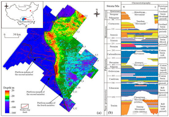 The Sichuan Basin is a typical intracratonic basin that has undergone more than 10 stages of tectonic–sedimentary evolution with relatively complete Ediacaran–Quaternary strata (Figure 1) [27,28,29]. A carbonate platform of the late Ediacaran–Ordovician and late Permian–middle Triassic has developed across the basin. The Lower Cambrian shale is a regional source, and the carbonate reservoirs in the Upper Ediacaran, Lower Cambrian and Upper Permian are the major gas-producing strata in the central basin [30,31].
