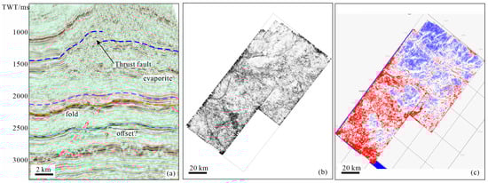 The coherence, curve, likelihood and fusion attributes have been used to identify strike-slip faults in the Sichuan Basin [17,22], but they are not favorable for the identification of small (vertical displacement <20 m) strike-slip faults in deep subsurfaces (Figure 2b,c). According to a seismic data analysis, multiple factors influence the imaging of the strike-slip faults. Firstly, seismic data cannot show the distinct offsets of the small strike-slip faults by conventional seismic processing [17,22]. This is correlated with the small vertical displacement that is beyond the seismic resolution, with a low main frequency of 20–30 Hz in the deep strata. Thus, the small strike-slip fault generally presents weak flexure without a distinct offset between the two fault walls. Owing to most of the vertical displacements along the strike-slip fault zones being less than 30 m in the study area [23], the low-amplitude fold in the faulted block is observed instead of the offset of the seismic event. Particularly, the image of the vertical fault surface is ambiguous in the deep subsurface. Secondly, the thrust belt, evaporate, and fold can mask the imaging of strike-slip faults and strata images (Figure 2a). Low-resolution seismic data generally present ambiguous images of the strike-slip faults and more pseudomorphic fault images in the seismic sections. This is closely related to the low signal–noise ratio of the seismic data in the deep subsurface. Subsequently, there are a multiplicity of seismic interpretations of the strike-slip faults in the central Sichuan Basin [22,23]. In addition, the ambiguous fault image in the seismic data is unfavorable for the mapping of fault combination. In this context, enhancing the hidden fault image by seismic data processing is significant for fault identification and interpretation.