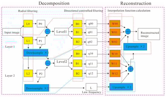 The optimal direction of the decomposed data is enhanced to investigate and highlight the geological information from the seismic data, as well as more clearly characterize and identify deep, small faults. Through a linear multiscale and multidirectional decomposition, the fault image can be automatically changed from the small scale to the large scale [33]. Small-scale information can reflect a detailed image of a hidden fault, while large-scale information can better reflect the macro information of a large fault. The decomposition processing is carried out by recursively calling the low-pass radial filter in the frequency domain to realize a pyramid-like structure [32]. Then, the bandpass filtering image from a different direction can be obtained by the directional controllable filter processing of each layer. Therefore, the image can be decomposed into sub-band information at different scales, and each layer can be decomposed into different directional data to obtain sub-band images that contain different directional information.