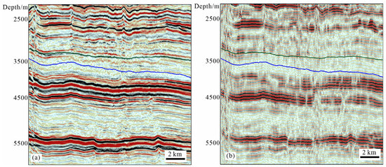 The seismic wave is more continuous in the deep strata, which can be attributed to the low-resolution seismic data that have shed the seismic response of the strike-slip fault (Figure 6a). Through seismic reprocessing (Figure 6b), the imaging of the deep strike-slip fault has significantly improved. The seismic resolution of the strike-slip fault increased with the increase in depth. With this enhanced seismic resolution, the strike-slip fault in the deep strata also presents a distinct seismic response. At the same time, it can easily be identified that the strike-slip faults developed along the vertical deformation belts.