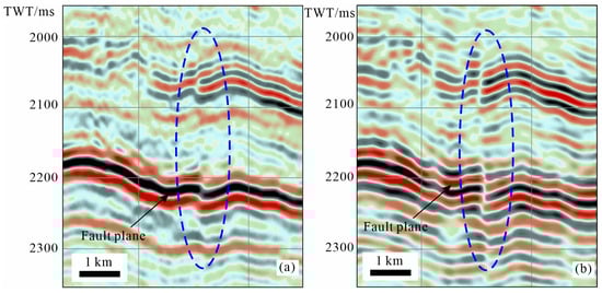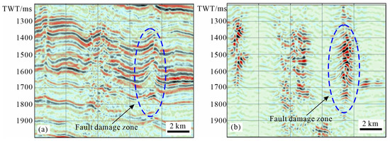 Furthermore, this processing method can highlight the discontinuity in the fault damage zone. Owing to the strike-slip fault zone being characterized with broad fracture zones, it usually shows discontinuous seismic reflection waves (Figure 6a). Although it is difficult to identify the smaller strike-slip faults, the reprocessed seismic data allow for highlighting the discontinuity in the damage zone and facilitate the identification of the fracture zone. The results show that the small strike-slip fault zone generally has a wide damage zone of more than 1 km (Figure 6b). The width of the fault damage zone is more than those in other areas with the same displacement [34,35,36]. Although the major fault plane is unclear and microfractures are difficult to identify, the boundary of the fault damage zone is distinct in the seismic images of the seismic discontinuity. In addition, the architecture and damage strength of the fault zones have a distinct seismic response too. Through seismic processing, the fault damage zone presents a distinct seismic response in the reprocessed seismic section (Figure 6b). The seismic discontinuity is favorable for the identification and description of the widths and strengths of strike-slip fault damage zones.