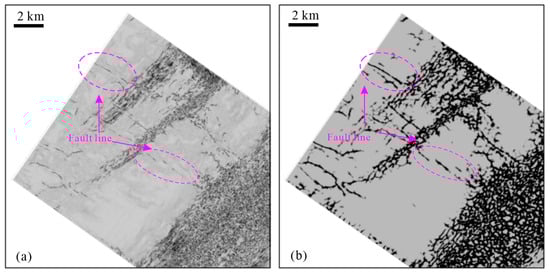 Furthermore, seismic processing can improve the image of the strike-slip fault in seismic planar attribute. Generally, the planar coherence, curvature, and amplitude attributes are of the most importance in the identification of strike-slip faults [22]. However, the planar seismic attributes generally show weak and ambiguous responses by the strike-slip fault (Figure 2b,c and Figure 7a). This has led to difficulty in identifying the strike-slip fault and subsequently different interpretation results in the Sichuan Basin [23,24,25,26]. Through the seismic processing, the extracted coherence attribute (Figure 7b) shows a clear fault line response, which can be used to identify the planar distributions of strike-slip faults. Combined with the distribution characteristics of en échelon/oblique faults, the seismic planar attribute is more advantageous than the seismic section for identifying hidden strike-slip faults.