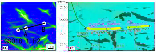 (a) Well trajectory in the planar symmetrical illumination attribute (the green–yellow bands show strike-slip fault damage zones) at the top of the Ediacaran and (b) seismic sections in the Anyue Gasfield (three-small strike-slip faults consistent with the reservoir sections that presents high fracture frequency and high porosity; A and B showing the location of the horizontal section).