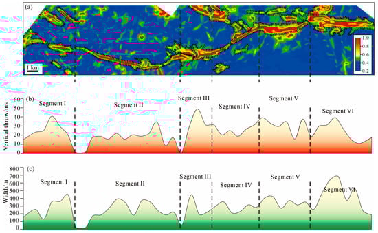 Through seismic processing, the seismic attribute shows a distinct fault segmentation (Figure 7b and Figure 8a). The strike-slip fault zone is characterized by several en échelon or oblique segments. Segmentation may be affected by the fault’s maturity, with fault growth and interaction [23]. It has been shown that most strike-slip fault zones, particularly of small fault zones, are in the isolated or soft-linkage stages. This suggests that the intracratonic strike-slip faults have obvious segmentation along the fault strike. This is consistent with the fault segments obtained by fault mapping [22,23]. Small fault zones generally present isolated and short segments. Large fault zones can present an overlapping zone with wider and longer segments. In this way, most small displacement but long fault segments need to be reinterpreted as having several segments. Furthermore, the overlapping fault zone could have developed from fault tip interaction. This is consistent with the power law of fault elements [25,34]. Although it is generally difficult to distinguish fault segmentation, the vertical throw and width measurement along the strike-slip fault zone is very helpful in fault segment discrimination and mapping (Figure 8a). The vertical throw of the single fault segment decreases from the center toward both ends, and it exhibits a sudden change between different fault segments, which can be attributed to the fault linkage [37]. However, the strike-slip fault is characterized with the much lower immaturity of the en échelon/oblique segments in the Sichuan intracratonic basin.