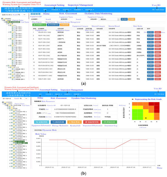 The user interface of the DRBI-IOWs system is shown in Figure 2, which inherits the advantages of traditional static RBI systems in human–computer interaction, such as device tree retrieval, batch data input, calculation and generation of maintenance plans, statistical analysis, and other functions. In addition, the system developed in this article also has some unique features, such as: