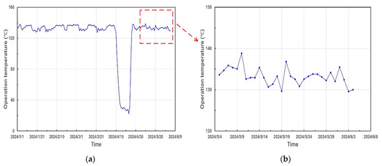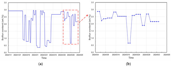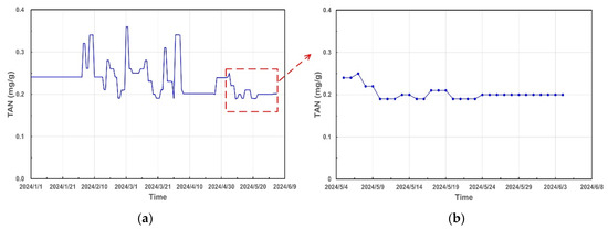 The underlying reasons for dynamic risk variation are confirmed by analyzing the related monitoring indicators. As shown in Table 1, the damage mechanism of 250-P-106-2.5A2 is high temperature sulfidation-naphthenic acid corrosion and the corresponding dynamic indicators are S content, TAN, and flow velocity. Figure 5a and Figure 6a illustrate the time-dependent trends of S content and TAN, respectively. To match the time interval of risk variation in Figure 4, the local-enlarged distribution diagrams of S content and TAN are, respectively, depicted in Figure 5b and Figure 6b. The variation tendencies of dynamic risk are totally consistent with the S content while there is no directly corresponding relationship between risk profile and TAN, which suggests the risk variation is mainly dominated with S content rather than TAN. It is noted that the flow volume data in the system remains constant from January 2024 and has no effect for the risk variation in Figure 4.