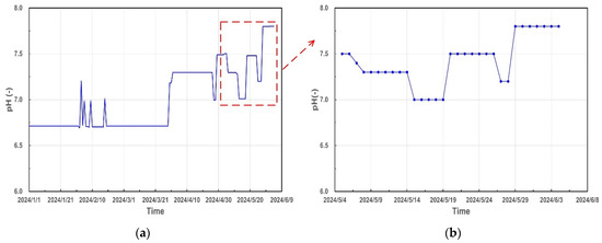Variation in pH with time for tube-side of heat exchanger E1-2/1-T of (a) and (b) local-enlarged diagram.