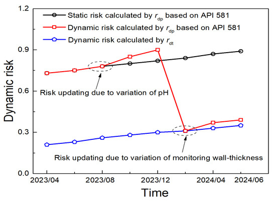 The above examples demonstrate that once the dynamic risk assessment procedure is established in the system, the risk will be continuously updated with dynamic indicators. However, the quantitative logics for corrosion rate diagnosing are not always available or reliable, especially in complex media environments. For instance, in the tower overhead system, API 581 [17] only provides a prediction method for hydrochloric acid corrosion. But it contains various media, such as HCl, H2S, CO2, and NH3, and the pH value is affected by the injection process, making it difficult to be accurately predicted using logical models. To solve this problem, the inspected or monitored wall thickness was used to calculate the dynamic risk and corrosion rate in this study. Although the update frequency is low, it ensures the accuracy of risk assessment when the predicting model deviates from the actual situation. Figure 11 is a sketch map to show a comparison of static risk calculated with predicted rdp according to API 581 and dynamic risk with predicted rdp or measured corrosion rate rdt. The results indicate that a significant deviation exists between the prediction and measured corrosion rate. Although rdp is used, the dynamic risk assessment model proposed in this study can also give a timely correction of the risk results by updating the process parameter pH or monitoring wall thickness, thus improving the accuracy of the risk calculation. Consequently, the re-assessment risk is necessary to determine whether a prediction model or a measured corrosion rate is selected for a specific corrosion loop. It should be stressed that the actual corrosion rate in plants differs significantly from theoretical models, such as sulfuric acid corrosion, hydrochloric acid corrosion, etc. For the corrosion rate prediction in complex media environments, proposing an essential calculated model is also difficult. Consequently, for a multiple media environment or corrosion without logical diagnostic models, machine learning techniques based on big-data collection from similar plants may shed light on this problem [32,33].