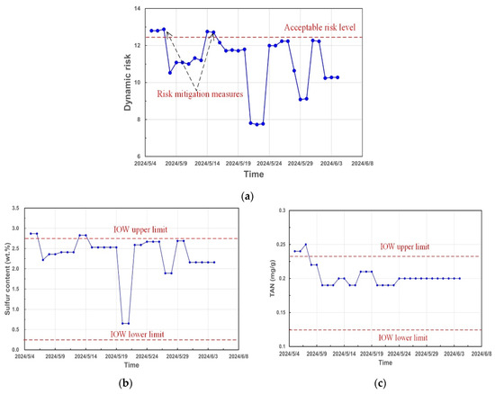 (a) Dynamic risk variation and acceptable level for prefractionator bottom C-1; (b) IOWs boundary control of S content; (c) IOWs boundary control of TAN.