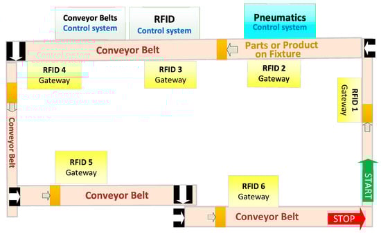 The assembly line comprises conveyor belts arranged in a closed loop (Figure 1). The transfer of objects from one belt to another is facilitated by automatic pneumatic pistons, which are extended upon contact with an object based on information from an inductive sensor, controlled by a pneumatic system. Product tracking is achieved through radio frequency identification.
