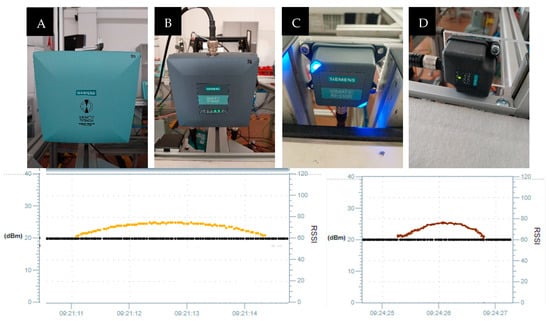 Two SIMATIC RF642A (865–928 MHz) units are employed, each with an external antenna (Figure 3A). The units are protected by an IP65 rating, and they are paired with SIMATIC RF310R (13.56 MHz) and SIMATIC RF240R (13.56 MHz) units (Figure 3C,D). It is also important to note the presence of modules for communication. These include SI-MATIC RF186CI (RFID communication module for PROFINET, Ethernet, EtherNet/IP, two connectable readers, and DI/DO interface) and RF180C (RFID communication module; two readers can be connected; without connection block for PROFINET).
