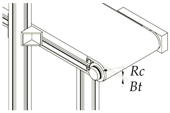 Since Rc is the radius of the drive cylinder and Bt is the belt thickness, Rc = 25.00 mm and Bt = 2.10 mm. Therefore, the total turning radius is 27.10 mm. Figure 6 presents a drawing with the dimensions of the drive cylinder and the thickness of the conveyor belt. The result is a constant for the PLC to recalculate the conveyor speed at each pulse change.