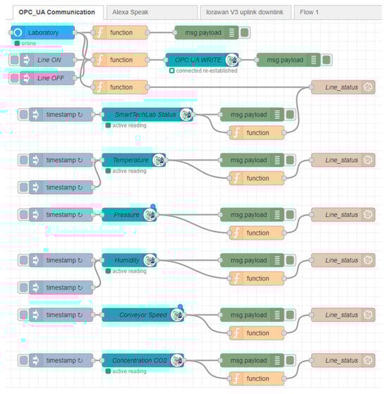 Figure 7 shows communication from the IoT gateway in the Node-RED platform. Node-RED is a flow-based development tool for visual programming to connect hardware devices, interfaces, and online services within the Internet of Things. Node-RED provides a web-browser-based flow editor. IoT Gateway analyzes and processes data from devices, providing instant data analytics.