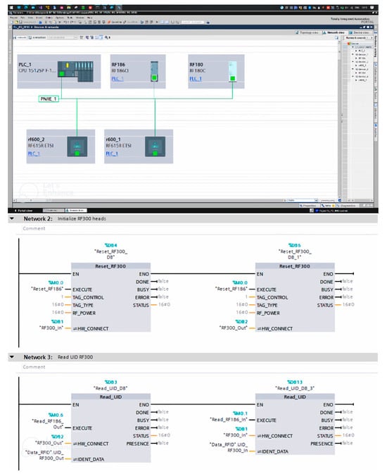 For the automatic data transfer from the RFID to the model, after the hardware configuration, it is necessary to set the reset and initialization of the reading heads within the program blocks of the TIA portal (Figure 8). Then, there is a block in the software that checks the presence and can simultaneously read the contents of the tag. This is carried out for the RFID RF200, RF300, and RF600 hardware series after each reset and initialization, and then after each presence and content reading.
