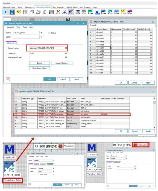 After setting the specific server address, the OPC UA client-side configuration follows. In this case, it is Tecnomatix Plant Simulation and the simulation of the assembly line of the research workplace. Objects are added to the simulation directly in the software environment. Within the tools, it is necessary to add an OPC UA object to the simulation, in which the address and port of the server are assigned, and the items are imported (Figure 9). The attributes of the simulation model for a specific device are then defined in the items [16]. In our example, the attribute is “Variable”.