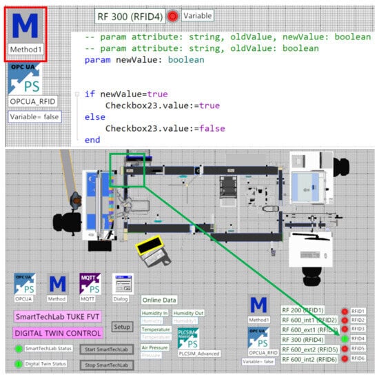 The last step is to add the method object (Figure 10). The Method object is used to program controls that trigger other objects to be executed by Plant Simulation during the simulation run. The program defines that if the state of the actual read head changes (true), the specific checkbox will also change to true (green RFID 4—Figure 10). Otherwise, it remains false (red). Separate objects must be created for each read head. The bottom part of Figure 10 presents a digital twin developed in Plant Simulation with automatic data exchange. This includes information from the laboratory, such as humidity, temperature, pressure, the status of the laboratory (ON/OFF), or the exact position of the parts on the conveyor using the RFID system. This means that if an RFID tag is near the RF300 Series reader head on the real line, RFID 4 will change from red to green in the simulation. Individual objects in the simulation can be placed where the read heads are located. It is also possible to define what information the tag carries (e.g., product number).
