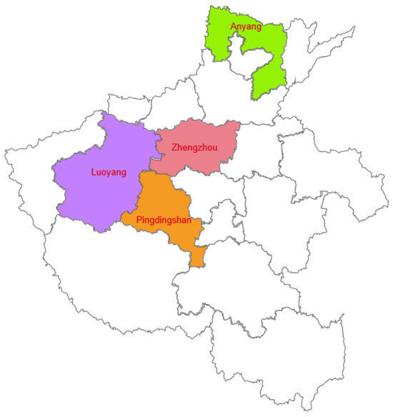 Henan Province, spanning between 31°23′ and 36°22′ north latitude and 110°21′ and 116°39′ east longitude, boasts a vast geographical expanse and encompasses 18 prefecture-level cities. Henan Province is considered China’s largest province in terms of installed renewable energy capacity and should be an important research target. Given the extensive territory of Henan Province, this study only focused on selected representative cities. These cities include the provincial capital of Zhengzhou (34°16′–34°58′ north latitude and 112°42′–114°14′ east longitude), the industrial hub of Luoyang (34°32′–34°45′ north latitude and 112°16′–112°37′ east longitude), and the substantial installed capacity of renewable energy power generation regions of Anyang (35°12′–36°22′ north latitude and 113°37′–114°58′ east longitude) and Pingdingshan (33°08′–34°20′ north latitude and 120°14′–133°45′ east longitude). Choosing regions with different latitudes and longitudes to include as many solar radiation conditions as possible can help improve the applicability of the model and reduce prediction errors. The geographic distribution of these selected cities is depicted in Figure 1. These cities collectively involve diverse weather patterns and varying conditions of photovoltaic power generation installation.