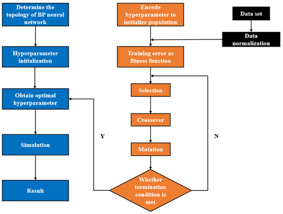 The genetic algorithm (GA) [18] serves as a stochastic global search optimization algorithm, mimicking the evolutionary principle of “survival of the fittest” observed in nature. The fundamental concept revolves around generating a population of individuals from an initial state, with subsequent iterations refining the population through random selection, crossover, and mutation operations. This iterative process drives the population towards regions of higher fitness within the search space. Through successive generations of reproduction and adaptation, the population gradually converges towards individuals that best suit the environment, ultimately yielding an optimal solution to the problem. However, gradient descent is susceptible to local optima and may struggle to achieve global optimization. By integrating the BP neural network with GA (GA–BP), the shortcomings of falling into local optima and suboptimal prediction model performance can be effectively mitigated. This hybrid approach offers enhanced robustness against local optimality and enhances prediction accuracy.