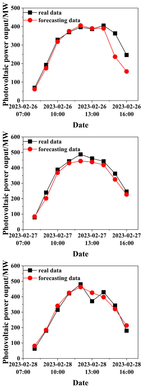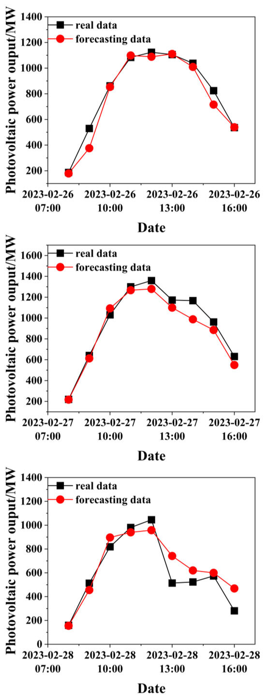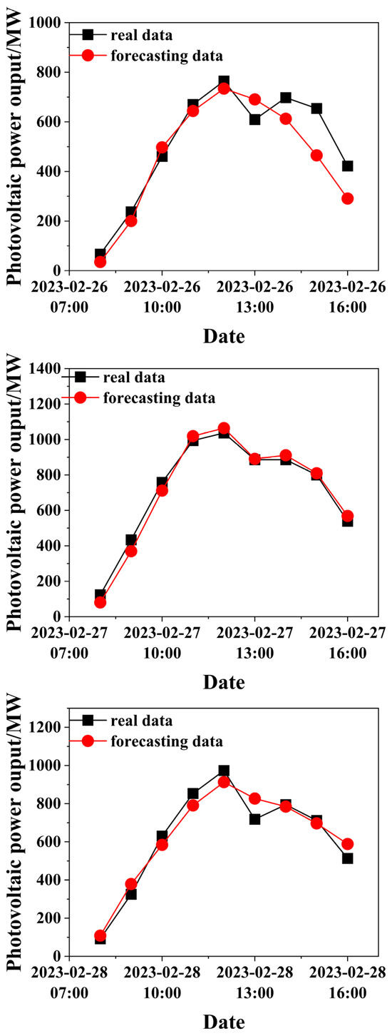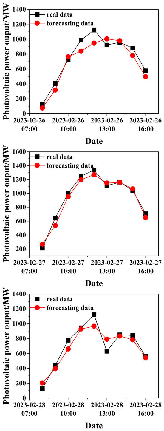 The forecasting results in non-rain and snow weather of Luoyang city (photovoltaic power output versus time of February 26, 27, and 28, 2023 from 8 a.m. to 4 p.m.).