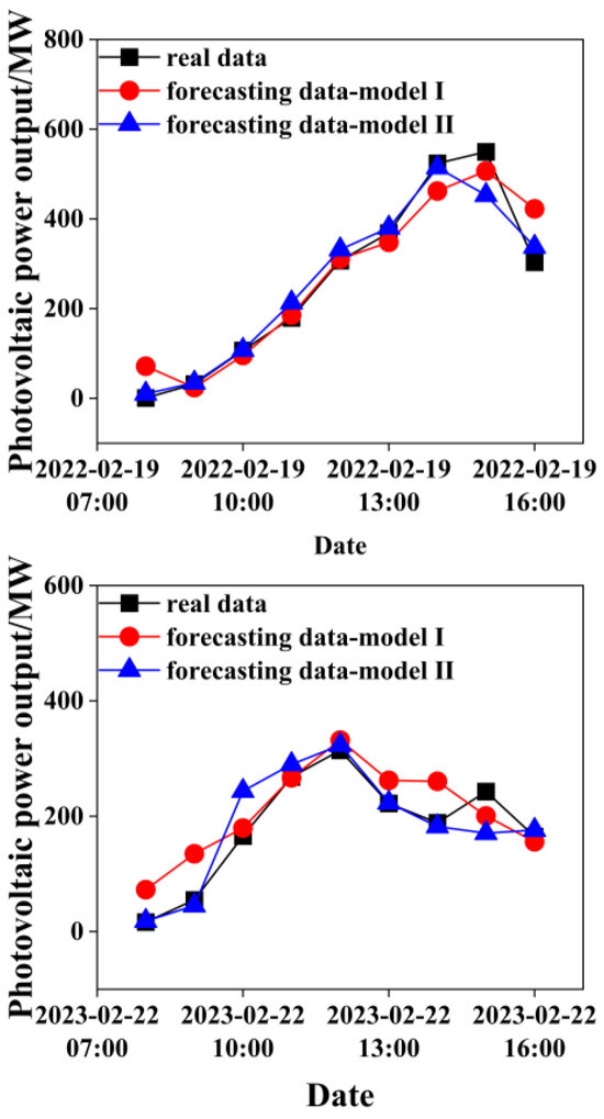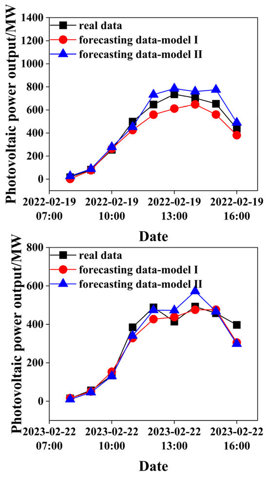 The forecasting results in rain and snow weather of Luoyang city (photovoltaic power output versus time of February 19, 2022 and February 22, 2023 from 8 a.m. to 4 p.m.).