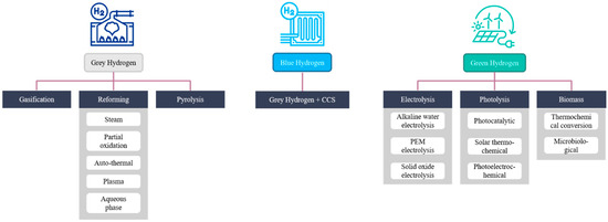According to hydrogen production technologies and energy sources, the clean energy industry often classifies by color [22,23]. The main classifications of hydrogen energy in colors are grey hydrogen, blue hydrogen, and green hydrogen [24,25]. The grey hydrogens refer to hydrogen produced by gasification [26], reforming [27] or pyrolysis of fossil fuels, causing carbon emission during the production process. The blue hydrogen combines grey hydrogen with carbon capture and a storage process, reducing the emission of carbon. Green hydrogen is produced by electrolysis (supplied by renewable electricity) [28], photolysis [29], or biomass [30] methods, which are carbon-free in the process. The main classifications of hydrogen energy and their corresponding production technologies as shown in Figure 1. In addition, hydrogen is classified by the industry based on lifecycle greenhouse gas emissions [31]. In 2020, the group standard “Standard and evaluation of low-carbon hydrogen, clean hydrogen and renewable hydrogen” was issued in China, classifying hydrogen into low-carbon hydrogen, clean hydrogen, and renewable hydrogen. In terms of carbon emissions of hydrogen, the carbon emissions of low-carbon hydrogen are no more than 14.51 kgCO2e/kgH2, while the carbon emissions of clean hydrogen and renewable hydrogen are no more than 4.9 kgCO2e/kgH2. Renewable hydrogen also requires that energy source of hydrogen production must be renewable energy.