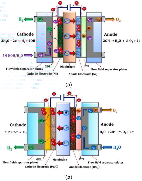 The most conventional and mature method for water electrolysis is ALK electrolysis, proposed by Troostwijk and Diemann in 1789 [59,60]. When the current passes, the water obtains electrons via reduction reaction at the cathode, producing H2 and hydroxide ions (OH−). To maintain charge balance, the OH− penetrates the diaphragm, which loses electrons at the anode, producing O2. The electrode reaction equations of ALK electrolysis are shown in Equations (2) and (3). Although there have been many studies on novel catalysts such as platinum-based catalysts [61] and crystalline catalysts [62], nickel-based catalysts remain the widely used catalysts for commercial ALK electrolyzers due to their relatively high electrocatalytic activity and low cost. In the past, thick asbestos diaphragms were generally used in AKL cells to separate the anolyte and catholyte compartments [63]. Recently, new materials such as nickel oxide, PTFE, and different types of polysulfone have been used to replace thick asbestos materials [64]. The electrolyte could help ionic transport and conduction; the most commonly used electrolyte in ALK electrolyzers is KOH solution with mass fraction of 20–30% [65]. Most ALK electrolyzers adapt tiny-gap or zero-gap structures to reduce ohmic loss [66]. In these structures, the electrode and diaphragm are very close, even in connection.