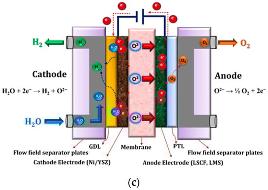 SOEC electrolysis has developed rapidly in recent years, but it still in the laboratory stage and is less mature commercially. The electrode reaction equations of SOEC electrolysis are shown in Equations (6) and (7). At present, oxygen ion (O2−) is the most common SOEC electrolysis carrier. In SOEC electrolyzers, water obtains electrons at the cathode, producing H2 and O2−, and then O2− penetrates the diaphragm and loses electrons at the anode, producing O2 [72]. SOEC electrolysis operates at high temperatures compared to other electrolysis technologies. The higher temperatures enable higher efficiencies of SOEC electrolysis [73]. However, that leads to attach the limiting condition to the choice of materials, demanding that electrodes and electrolyte materials retain stability under high-temperature conditions. Currently, anodes commonly use perovskite and cathodes use ceramic–metal composites or perovskite. Materials with high ionic conductivity, such as yttria-stabilized zirconia (YSZ) and doped ceria (CeO2), are typically used as electrode materials in SOEC electrolysis [74].