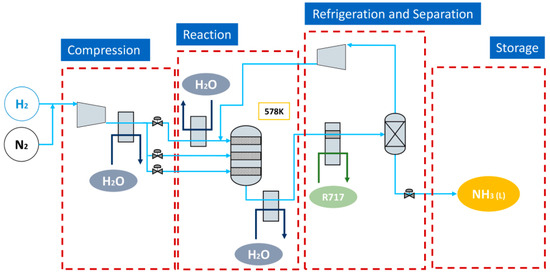 The ammonia synthesis process system from H2 and N2 consists of four parts: a compression unit, a reaction unit, a refrigeration and separation unit, and a storage unit. The system diagram is shown in Figure 4. First, the fresh H2 and N2 are mixed together, where N2 is extracted from the air via different methods including cryogenic distillation, pressure swing adsorption, and membrane separation [148]. Then, the mixed fresh gas is compressed to the required pressure by multistage compressors. At the heat exchanger, the compressed gas is heated up before entering the synthesis reactor. Similar to methanol synthesis, the ammonia synthesis reaction has a low single-pass conversion efficiency in the reactor [149]. In the refrigeration and separation unit, unreacted H2 and N2 are separated with the produced NH3 and are returned for recycling reactions. The produced NH3 is stored in tanks in a liquid form.