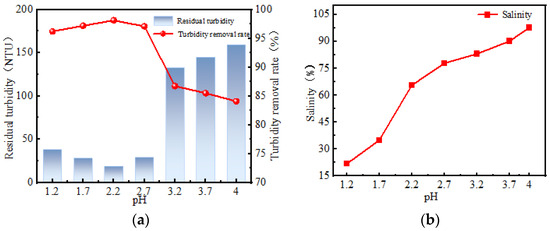 (a) Influence of pH value on the turbidity removal rate of polymerized aluminum magnesium chloride; (b) Effect of pH on the salinity of polymerized aluminum magnesium chloride.
