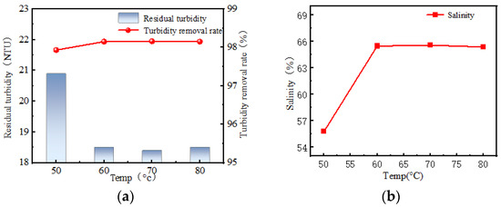 (a) Effect of polymerization reaction temperature on the turbidity removal rate of polymerized aluminum magnesium chloride; (b) Effect of polymerization reaction temperature on the salinity of polymerized aluminum magnesium chloride.