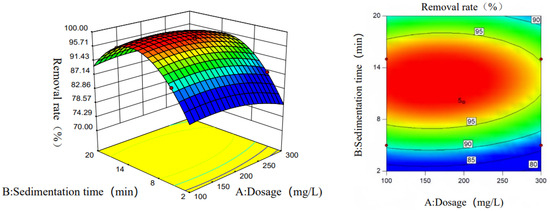 From Figure 6, it can be seen that the slope of the three-dimensional surface map of the two factors of dosage and settling time is steeper, which can be concluded that the interaction between the two factors of dosage and settling time has a significant effect on the experimental results; at the same time, it can be seen from the contour map, the contour map shows an elliptical shape, which can also be obtained by the same conclusion, that is, the dosage and settling time have a more obvious interaction. Therefore, a comprehensive analysis can be obtained that the interaction between the two factors of dosage and settling time is significant.