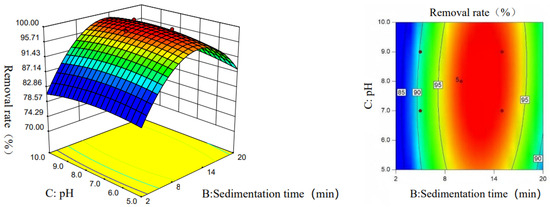 Figure 8 shows the three-dimensional response surface plot of pH and settling time on the turbidity removal rate, we can see that its slope is very steep, indicating that the interaction between the two factors has a significant effect on the turbidity removal rate; after that, by analyzing the contour plots of pH and settling time on the turbidity removal rate, we can see that the contour plots show an elliptical shape, and we can reach the same conclusion. Therefore, it can be concluded that pH and settling time have a significant effect on the turbidity removal rate.