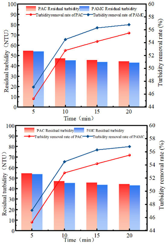 To investigate the effect of settling time, on the coagulation effect of printing and dyeing wastewater, in the case of fixing other conditions remain unchanged, change the settling time, the test results are shown in Figure 11. With the increase in the settling time, the turbidity removal rate gradually increased. In the period from 5 min to 15 min, the turbidity removal rate increases faster and remains basically unchanged after 15 min. The main reason for this phenomenon is that when the flocculant is added to the water body, it will produce flocs of different sizes (alu-mina), and in the period from 5 min to 15 min, some larger flocs settle, and the turbidity removal rate increases; after 15 min, the larger flocs basically settle, and only a few small volume flocs are left, so the turbidity removal rate increases more slowly. In conclusion, the best settling time in this test is 15 min, and polymerized aluminum chloride-magnesium has a better coagulation effect at the same settling time. Aluminum chloride-magnesium polymer is a composite flocculant composed of aluminum and magnesium, and the presence of magnesium ions increases the flocculant’s bilayer pressure and adsorption electro-neutralization capacity, and its neutralizing ability is enhanced. Therefore, its turbidity removal rate is better than that of polymerized aluminum chloride.