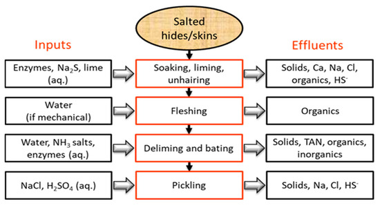 Tannery operations generate significant volumes of TWW, characterized by high concentrations of various pollutants. While the volume and character of TWW varies from tannery to tannery, it has been estimated that a metric ton of raw hide/skin yields 450–730 kg of solid waste, approximately 500 kg of wet sludge, and 20–40 m3 of complex effluent containing residual processing chemicals [2,7]. Beamhouse operations consist of processes that pre-treat the skins or hides before tanning, namely, soaking, liming, unhairing, fleshing, deliming and bating, and pickling (Figure 2). Salt is used to preserve skins and hides, but if green (unsalted) hides are processed, the effluent is less saline. The solids consist of organic as well as inorganic matter, with most of the organics consisting of fats and proteins removed from the hides and skins during unhairing and fleshing [2,7]. The exact nature of the TSS in the beamhouse effluent depends on the types of skins or hides that are processed and seasonal factors [2,7].