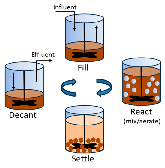 Aerobic sequencing batch reactors (SBRs) combine the aeration tank and clarifier in one unit, operating in feed, react, settle, and decant cycles (Figure 4). The react step is aerated and mixed, and the duration of each step, as well as the amount of ML that is retained between cycles, can be manipulated to achieve optimal performance [54]. Similar to CAS systems, settling problems due to poor floc formation may be experienced in SBR systems treating TWW, and interventions such as the addition of polyelectrolytes or TWW dilution may be needed to reduce settling times to practical levels [55]. To the best of our knowledge, only laboratory-based SBR systems treating TWW have been described in the literature, suggesting that they may not perform well when scaled up. One study employed synthetic TWW only. Although a wide range of operational parameters were tested and good sludge granulation and removal efficiencies were reported, the synthetic TWW consisted mostly of milk powder and ammonium sulfate ((NH4)2SO4) [56], so it is difficult to extrapolate the results to real TWW given the complexity of this waste stream. Another study used a temperature controlled (30 °C) and bioaugmented system, which would not be practical or economical to operate in the ‘real world’ [14].