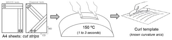The hot bend method for determining the curl potential consists of three steps (Figure 2): (i) the preparation of sample strips of around 20 × 210 mm2, followed by a conditioning phase at 23 °C and 50% RH for at least 4 h; (ii) placement of each strip in contact with a heated, curved metal plate (at around 150 °C) for 1–3 s by holding each end with the fingertips; and (iii) holding the sample vertically over a template kept on a flat surface to determine the magnitude of the developed curvature through a comparison with arcs of known curvatures. The concave face of the curvature is typically developed towards the side kept in contact with the heated plate, with positive values being attributed to the magnitude for these cases. Otherwise, negative values are associated with the magnitude readings. The hot bend method is performed for the two geometrical paper directions, the MD and CD, and, in each case, for the bottom side (BS) and the top side (TS) facing the plate. As such, four tests are executed and analyzed for each sample: MD-TS, MD-BS, CD-TS, and CD-BS. At least two strips/repetitions were analyzed for each test, with the average value being determined and used. The predominant curl tendency for each direction (MD and CD) is then calculated by subtracting the average of curvatures obtained on the TS tests to those obtained on the BS tests [,,].