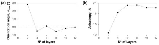 Effect of the number of sheet-splitting steps on the overall fiber orientation of sample DT3 (i.e., obtained by combining the data of the layers obtained till that point), produced using the paper machine PM-A: (a) orientation angle, θmax; (b) anisotropy, A.