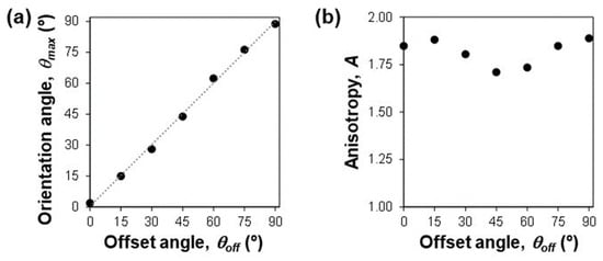 Impact of the introducing offset angles, θoff, during the imaging step on the measurement of the FO of the top layer of sample DT1, produced using the paper machine PM-A: (a) orientation angle, θmax; (b) anisotropy, A.