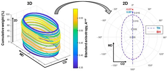 The data of the different layers were then combined to obtain the FO distribution of the two halves, BH and TH, and of the entire sample (i.e., the overall result, BH + TH). The values of the orientation angle and of the anisotropy calculated from these FO distributions are shown in Table 3. Additionally, the modulus of the difference between the two halves for the two properties is also presented, |TH − BH|, to assess the level of FO two-sidedness of the samples.