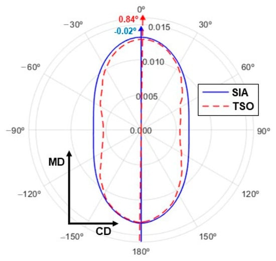 At the paper machine, the web sheet is stretched in the MD (usually around 1 to 3%) by the application of draws between the pressing and the drying sections, leading to the introduction of drying stresses (i.e., internal stresses introduced after drying) in the MD. On the other hand, the sheet is allowed, to a certain degree, free drying in the CD, especially near the borders, and less so in the center of the web. Thus, a lower level of drying restrictions is applied along the CD when compared to the MD []. As previously mentioned, the drying stresses introduced in both the MD and CD impact the TSO results, leading to different TSO and FO distributions [,,]. In particular, the orientation angle of the TSO distribution is only similar to the one of the FO distributions for sheets with preferential fiber alignment around the MD (i.e., θmax < 5°). Otherwise, the two angles will differ, with the difference increasing for higher orientation angles of the FO distribution []. Additionally, a smaller FO anisotropy is attained when compared to the corresponding TSO anisotropy []. The results obtained in this work are consistent with these effects (Figure 7). In particular, the values obtained for the fiber orientation angle and for the TSO angle were similar and around 0°. On the other hand, a value of 1.96 was obtained for the FO anisotropy, whereas a higher value of 2.41 was determined for the TSO anisotropy. Therefore, the SIA methodology developed in this work is successfully validated.