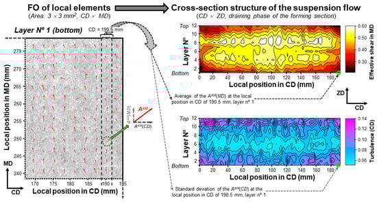 The second aspect regards the analysis of the cross-section (CD × ZD) structure of the suspension flow at the draining phase of the forming section of the paper machine. To this purpose, the standard anisotropy of the elements of a given layer located at the same position in the CD (i.e., corresponds to an MD strip in the layer) was analyzed. In particular, the average of the MD component of the standard anisotropy, Astd (MD), of the local elements in the MD strip of the layer was used to estimate the effective shear in the MD, while the standard deviation of the CD component, Astd (CD), was used to estimate the turbulence []. The calculation of these two properties for a single point is exemplified in the right side of Figure 8, being signaled by a circle (green color) in the two representations of the cross-section (CD × ZD) of the suspension flow.
