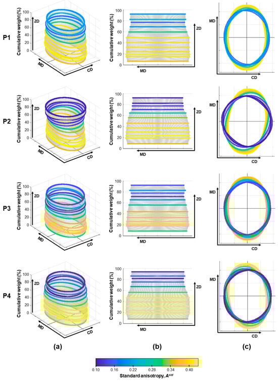 Results obtained of the FO distribution in the ZD (polar coordinates used) using the SIA methodology for samples produced using the paper machine PM-B at different positions in the CD: (a) 3D visualization (left column); (b) MD vs. ZD (center column); (c) CD vs. MD (right column). The color map indicates the corresponding standard anisotropy, Astd.