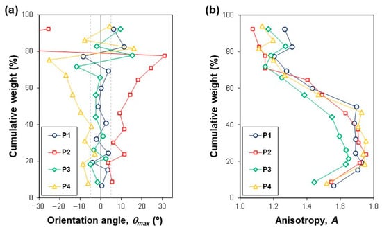 Several interesting observations can be made from the analysis of Figure 10. The variation of the orientation angle in the ZD was highly dependent on the position in the CD. Samples P1 and P3, located, respectively, near the edge and at the middle of the jumbo roll, have orientation angles close to 0° till a cumulative weight of around 70%. At the top layers, higher values are observed for the orientation angles, varying rapidly between negative and positive angles, possibly due to reduced anisotropy. In fact, the anisotropy at the top layers is significantly lower and close to 1 (i.e., the corresponding angular FO distribution is almost a circle), justifying the instability in the orientation angles. On the other hand, samples P2 and P4 are located at symmetrical positions in the CD of the jumbo roll, namely at around 2.1 m from the left and from the right edges, respectively. These samples presented a significant orientation misalignment with the MD, with positive orientation angles being observed for sample P2 and negative for sample P4. Thus, the direction of the suspension flow during the forming phase pointed slightly to the center of the paper machine, close to the positions P2 and P4. In addition, the absolute values of the orientation angle did not change significantly in the bottom layers, until around a cumulative weight of 40%, probably promoted by water drainage and by fiber packing taking place near the wire. This effect is less pronounced in the top layers, leading to a fiber misalignment that increases almost linearly from a cumulative weight of 40%, near the middle of the sheet, to around 80%, near the top. Similar to samples P1 and P3, the reduced anisotropy levels obtained for the top layers led to unstable and meaningless orientation angles.