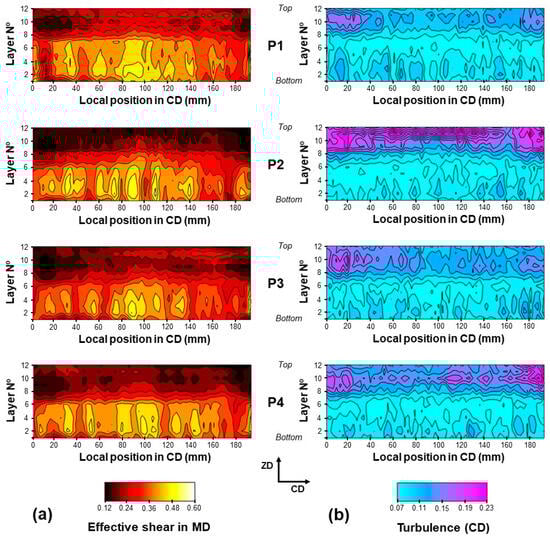 The analysis of both properties, effective shear in the MD and turbulence, indicates the existence of similar flow dynamics in the two sides of the sheet at the draining phase of the forming section (see Figure 8). These conditions secure the formation of paper with a rather symmetrical FO distribution in the two halves, bottom and top, as previously seen in Figure 6 and Table 1. Therefore, the produced paper is not expected to present structural curl-related problems due to FO two-sidedness.