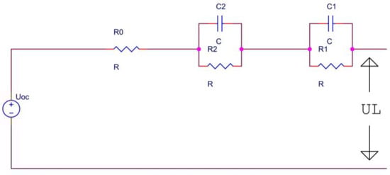 In the equivalent circuit of a battery cell, the circuit typically consists of a voltage source, a series resistor, and one or more parallel resistor capacitor pairs. The voltage source provides open circuit voltage, while other components simulate the internal resistance and time-dependent behavior of the battery. Here, we considered the efficiency and computational burden of the algorithm, so we adopted a second-order RC equivalent circuit model. Figure 1 shows the schematic diagram of the second-order RC circuit model, which is characterized by its physical model containing two sets of parallel capacitors and resistors. At the same time, it included the open circuit voltage and the internal resistance R0 of the battery. The main reasons for this are as follows.