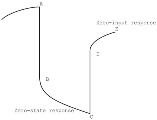 At point B, the battery begins to load the current for a short period of time, so we consider point B as the time t = 0. At this point, we can use Formulas (1), (3), and (4) to obtain a new formula: